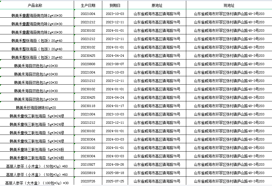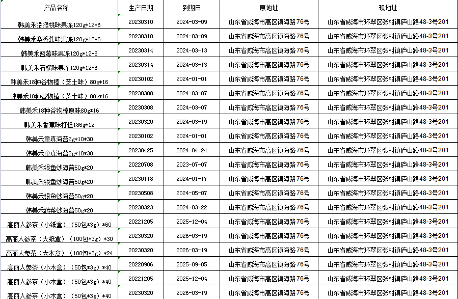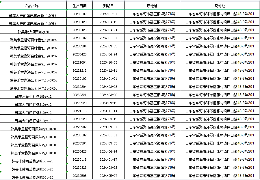 威海市韓味源食品有限公司(以下簡稱“公司“或“本公司”)進口的以下韓美禾產(chǎn)品,因公司更換經(jīng)常場所,營業(yè)執(zhí)照地址進行變更。故以下產(chǎn)品在出庫前已通過標簽加貼方式把地址予以整改,特此公告。